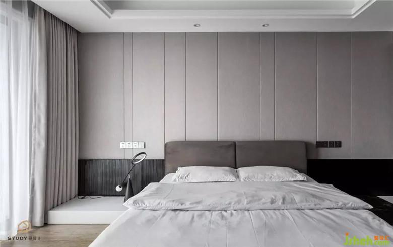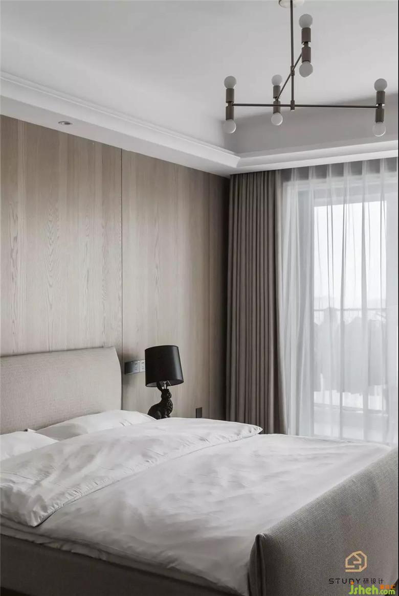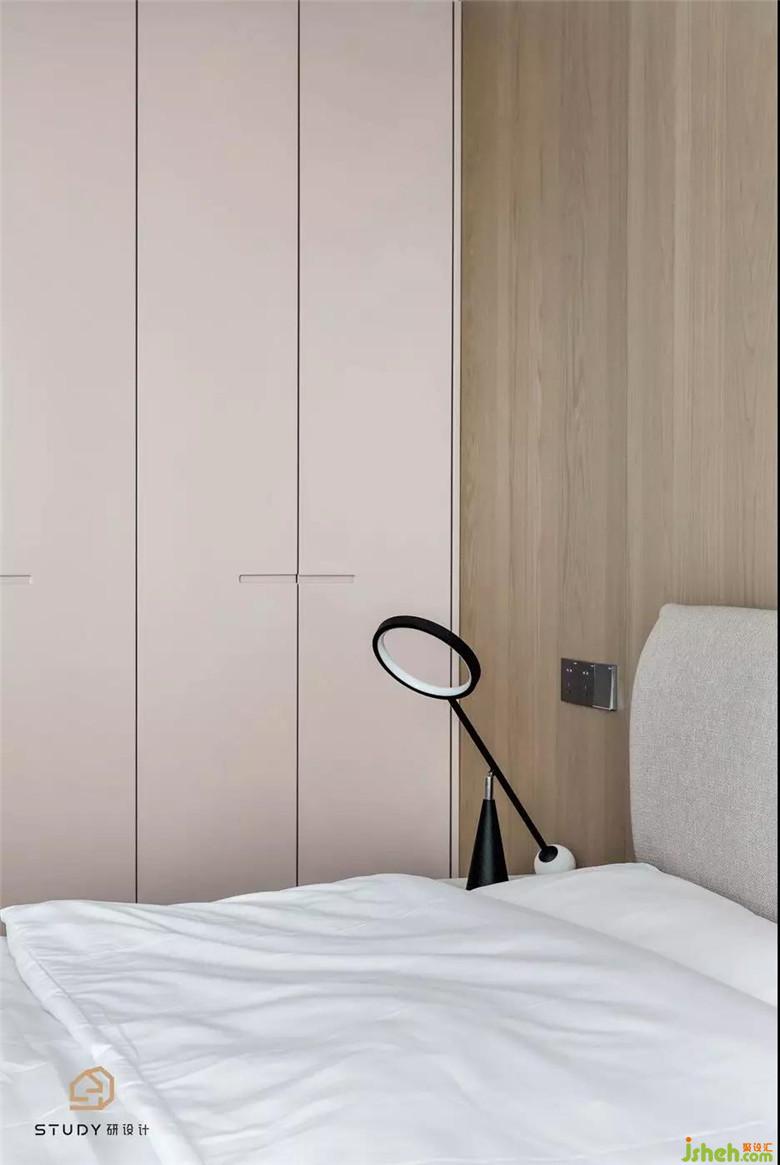 次臥室改變了原先呆板對稱的床頭造型,取而代之的是自帶溫柔屬性的天然木飾面,次臥室為父母居住,硬裝與軟裝家具使用的都是較為素雅的色彩與材質,室內設計師使整個空間更具浪漫舒適的溫情。