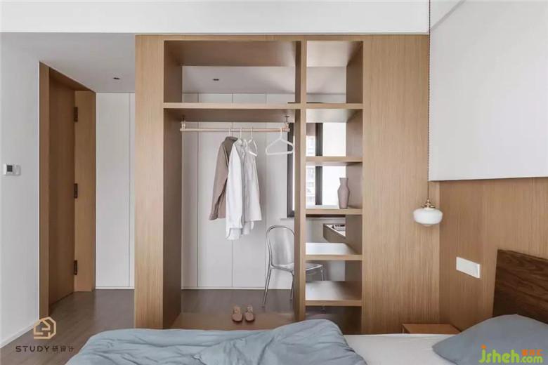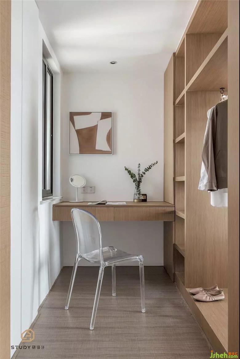 室內(nèi)設(shè)計師改變主臥開??向,將原本冗?的過道部分和主衛(wèi)納?主臥。衣帽間沒有獨立,通過了解屋主的衣物收納需求后,將衣帽間部分敞開,雙向通透。敞開處放置近期衣物和日常使用。?帽間安放了?主的梳妝臺,?平???的桌?,裝飾物不必太多,?凈整潔就是她最喜歡的樣?。