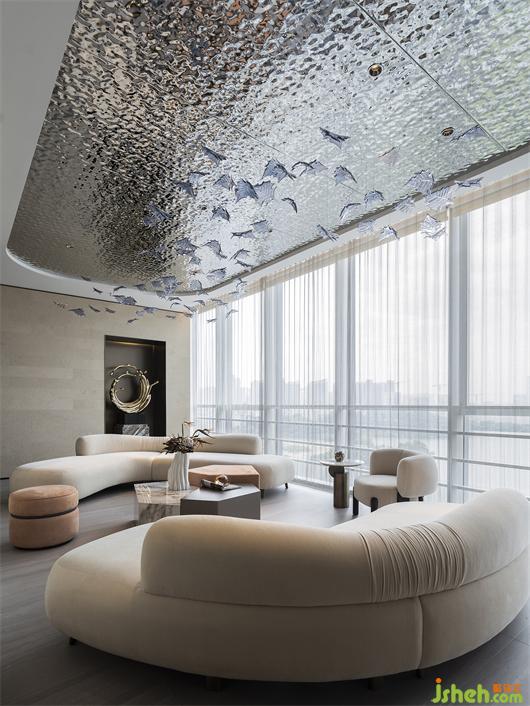 水紋不銹鋼和琉璃楓葉的交織,湖水﹑天光推移出虛實的變化。當代美學與自然風物和諧共生,為空間帶來漣漪,微風拂面中探尋多彩陽光的詩意生活。
