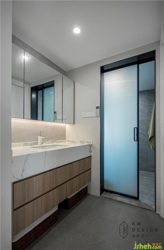 衛(wèi)生間用長虹玻璃做功能分離,不影響采光的同時也能很好的滿足屋主的衛(wèi)浴享受。即使在未來人員增加的情況也能滿足順暢的起居習(xí)慣。粗狂的石材紋路搭配細膩的木材紋理打造簡約浴室柜。鏡柜和懸空位置的收納籃都可以做到很好的儲物,保證空間整潔美觀。海淘回來的漢斯格雅的龍頭及潔具各司其職,為主人提供高品質(zhì)生活。