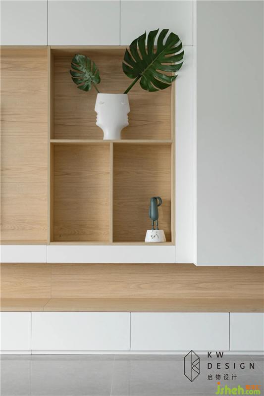 進(jìn)門左邊是到頂鞋柜與餐邊柜的結(jié)合,餐邊柜墻面刷了淺灰色乳膠漆做空間的功能區(qū)分,黑色開放格增加了立面層次感。室內(nèi)設(shè)計(jì)師