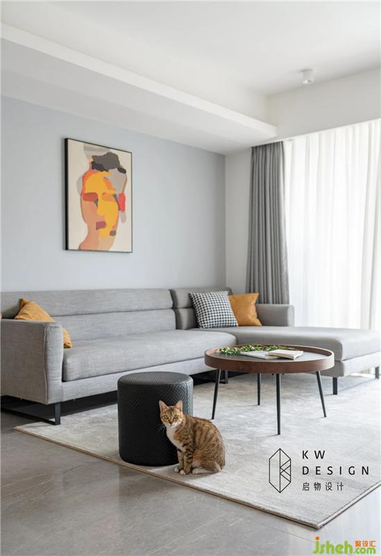 中性色彩有效沉淀空間情緒,各種質(zhì)感的灰,棉麻的,絨面的,織面的,搭配以淺藍(lán)色鋪陳的背景,抽象的藝術(shù)彩色掛畫,為屋主提供了一個(gè)舒壓明亮的開放空間。