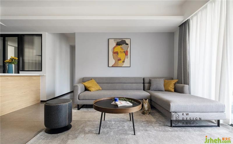 白色窗紗增加了室內(nèi)空間光影的表現(xiàn),錯(cuò)層的天花吊頂消弭了低梁的壓迫感?;疑獿形沙發(fā)與地毯織品,增加溫潤(rùn)的柔和感。