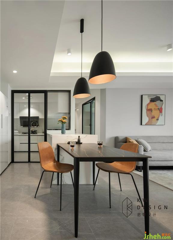 不規(guī)則灰色紋理的雪花白巖板吧臺(tái),和規(guī)則金色紋理的黑色巖板餐桌形成了強(qiáng)烈的視覺對(duì)比,棕色皮質(zhì)餐椅搭配簡(jiǎn)約黑色吊燈,為熱愛生活的主人提供一處滿足味蕾和觸覺的溫馨舒適小天地。室內(nèi)設(shè)計(jì)師
