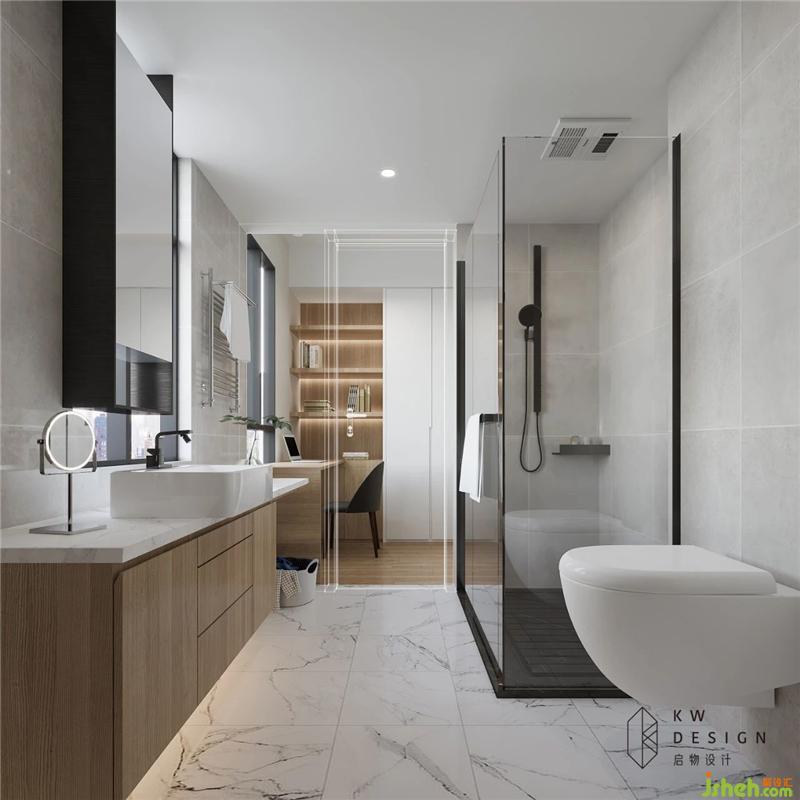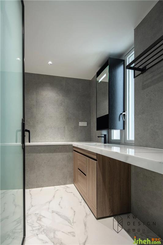 主衛(wèi)延用整體空間白灰色調(diào)搭配不同木色和不同質(zhì)感的黑色打造整潔舒適的洗浴空間。