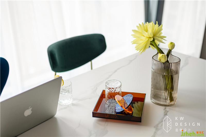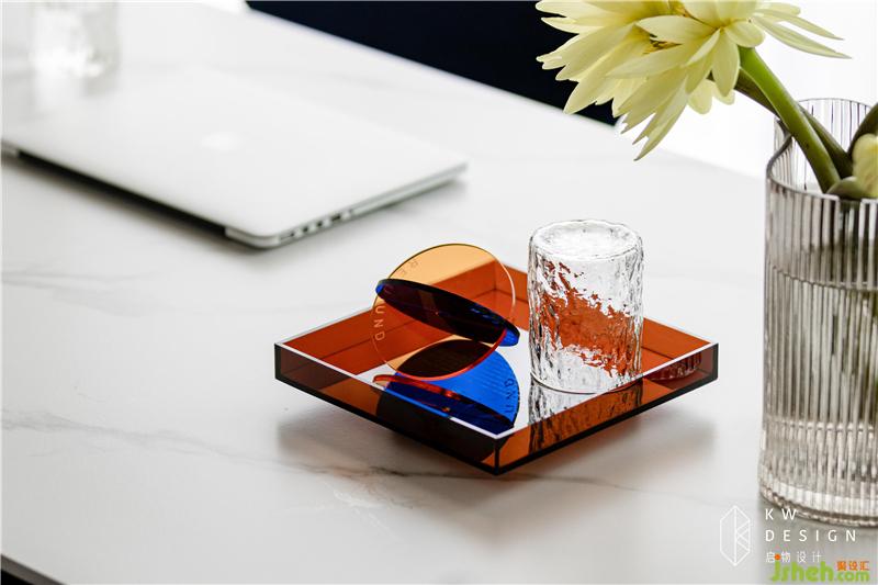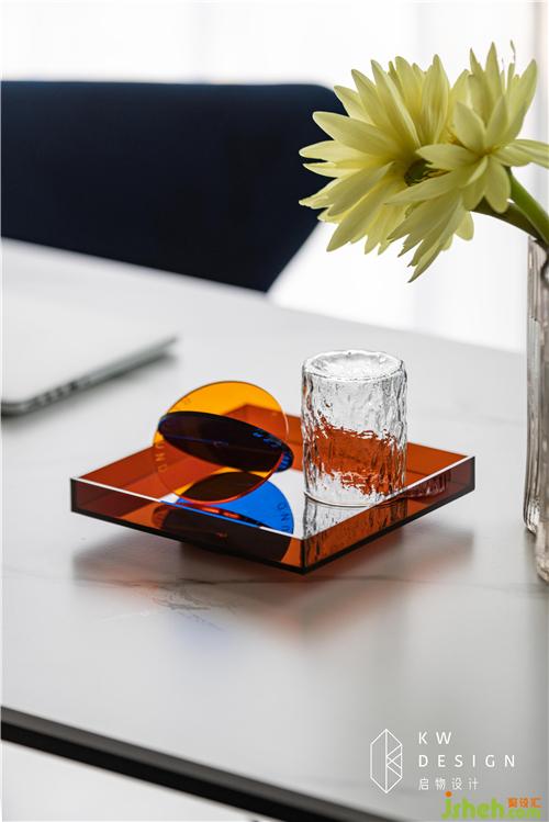 藍橙鮮亮的茶杯盤,柔嫩鵝黃的綠桿睡蓮是空間主色調(diào)的小面積補充,更是亮光和啞光碰撞,激發(fā)出生活多姿多彩的一面。