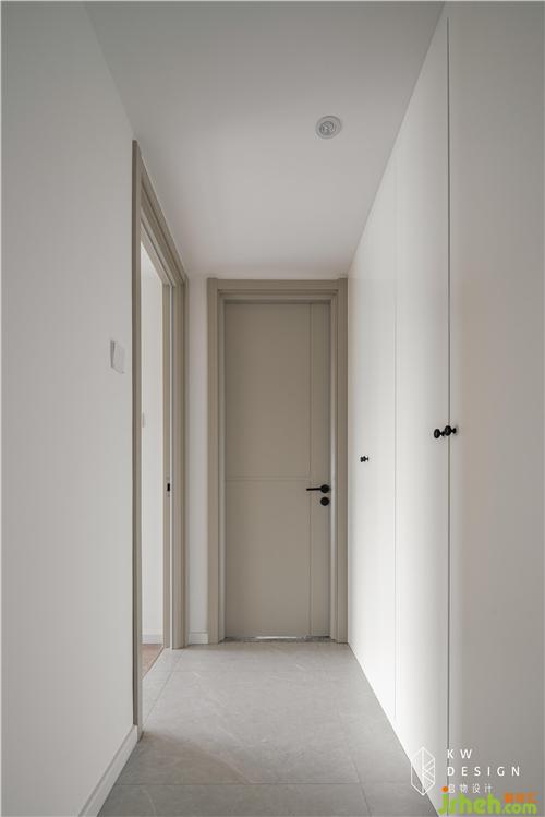 從主臥出來往客廳望去,寬闊狹長的走廊不僅擁有全屋的集中隱藏式收納柜,而且留白式設計非常具有藝術走廊的美感是室內(nèi)設計師的最愛。