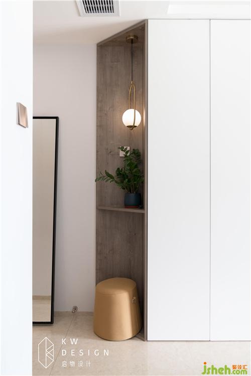 抬頭望一望墻柜的一端,早已改換成了端景柜:中灰色隔斷板層,內(nèi)置小小一盆綠植,金屬時尚掛燈靜靜灑下光芒。這是來自墻柜的溫柔。收納滿分的它也并不總是沉悶而無趣的。