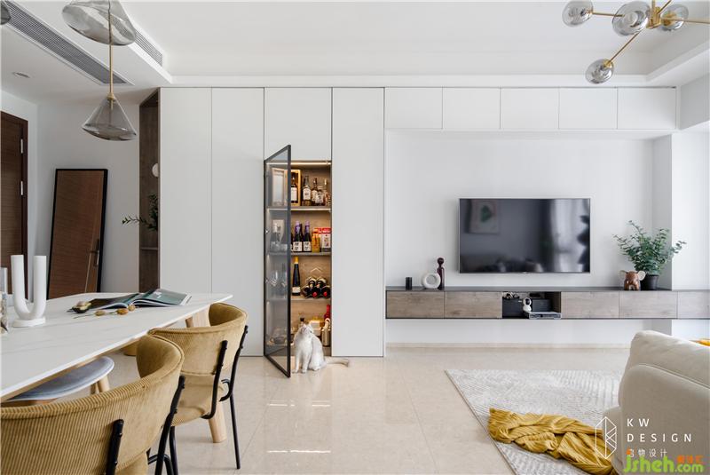 客廳的正面時尚感撲面而來:室內(nèi)設計師設計的內(nèi)藏燈帶的酒柜,暖光搭配原木,透過黑色邊框玻璃柜門瞟一眼珍藏的美酒,是廣告片里品質(zhì)生活的場景。