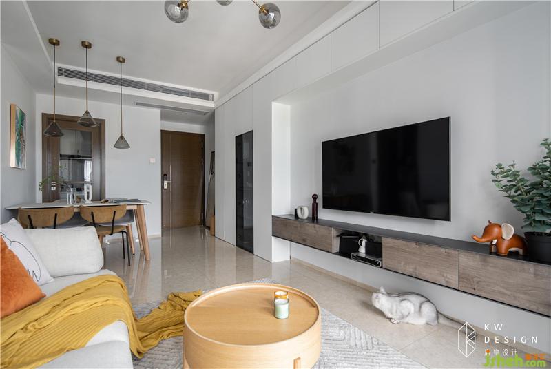 墻柜一直延伸至電視背景墻,增添視覺延伸性,電視柜往里推進,離沙發(fā)越遠,離視覺舒適越近。