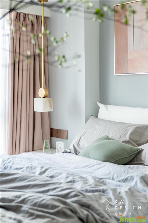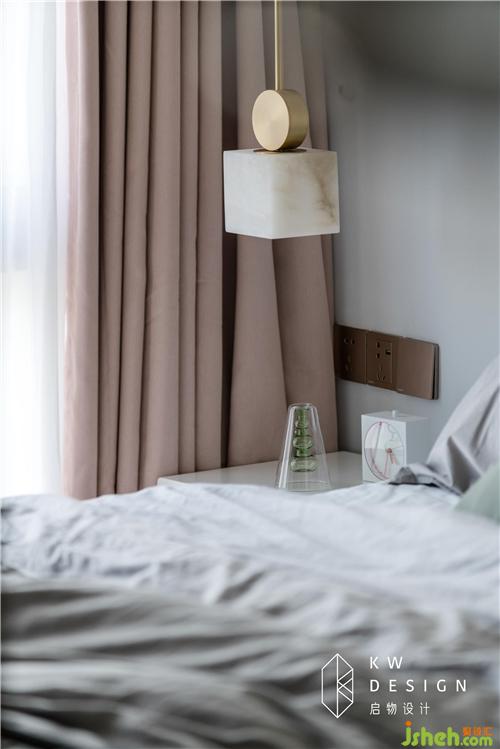 床頭柜這邊再增加一個(gè)幾何圖形的吊燈打破房間的沉悶:金與石,方與圓,冷與暖,直與曲。這是簡(jiǎn)約不簡(jiǎn)單的設(shè)計(jì)體現(xiàn)。