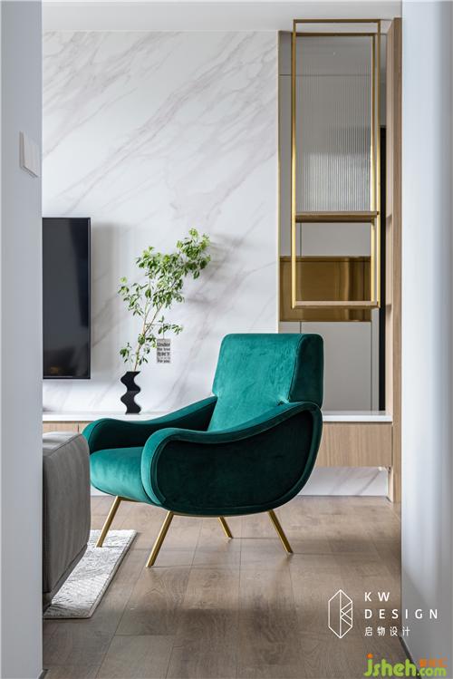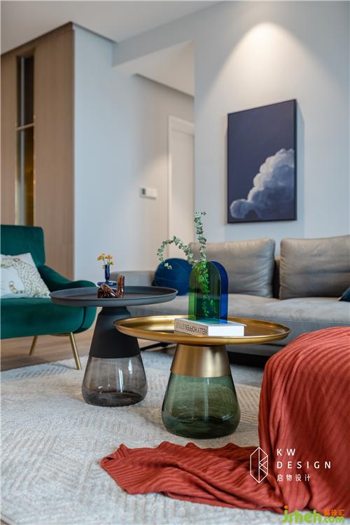 而藍(lán)、綠、紅抱枕飾品、米咖、金色玻璃拼接茶幾、丹麥同色系異形花瓶等的采用既增添色彩活力,又讓客廳具備滿滿設(shè)計(jì)感和新鮮度。