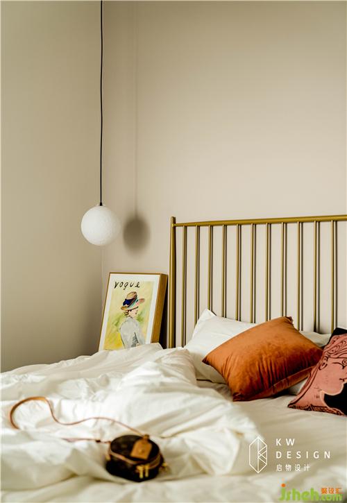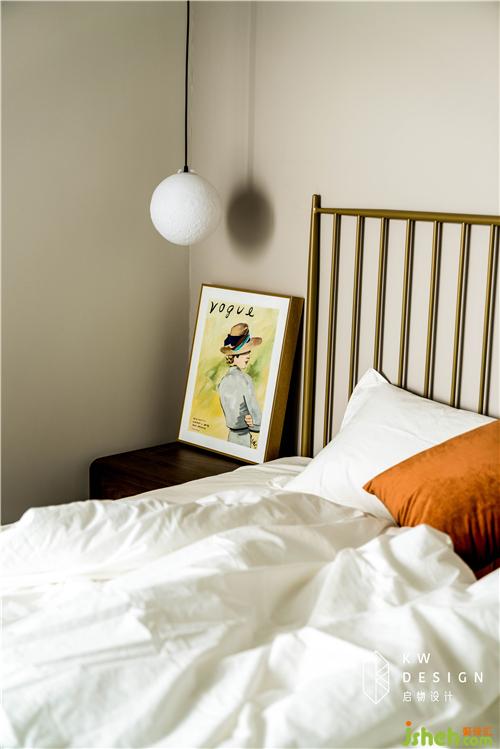 自然垂落的月球燈,胡桃木床頭柜搭配ins風(fēng)的鐵藝床,凸顯出空間的年輕、時(shí)尚氣息。