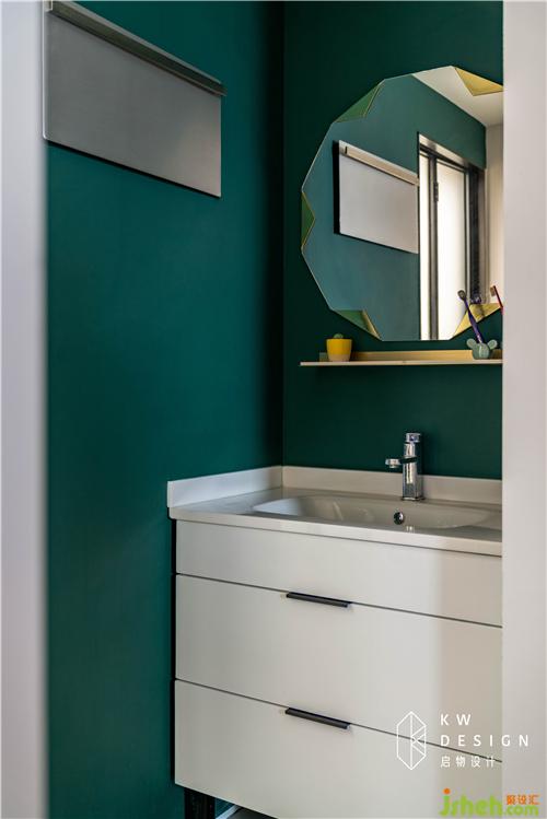 衛(wèi)生間洗手臺(tái)位置和過道作為公共空間,延用客廳的墨綠色作點(diǎn)綴和功能分區(qū),不同的是刷的外墻漆,防水耐用。個(gè)性的鐵藝鏡搭配懸空白色浴室柜,打造時(shí)尚清新的洗漱空間。