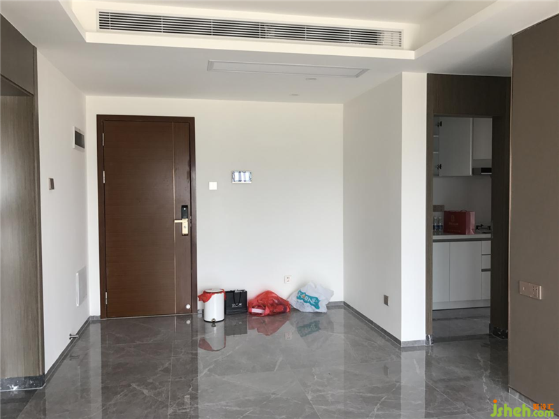 原精裝房的淺灰色地磚還是蠻百搭的,要是啞面材質(zhì)就完美了??梢钥吹讲蛷d并不大,如果再擺上冰箱,空間就去掉大半了。