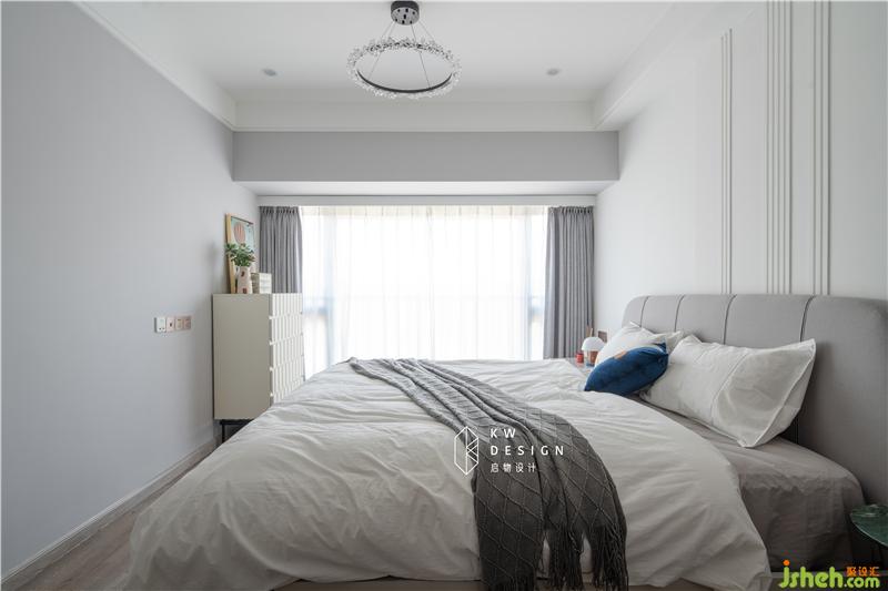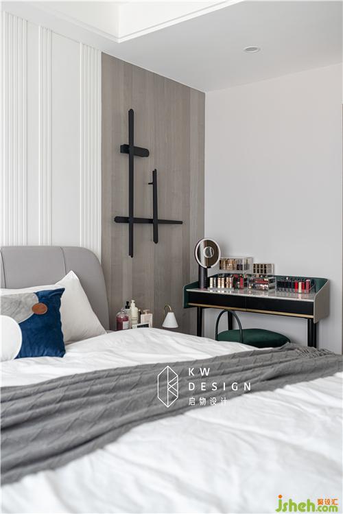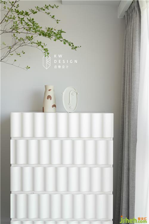 白色波浪面板的斗柜超溫柔,與臥室靜謐氛圍相契合,上層放置Kelly的奇珍異寶,下層抽屜收納貼身衣物或書本,方便美觀。