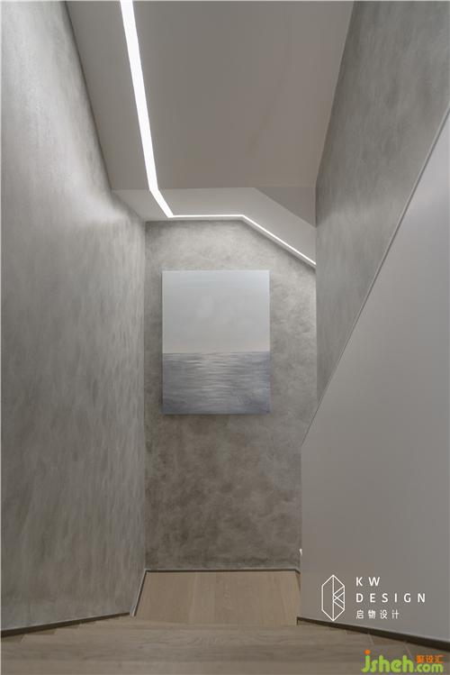 樓梯以水泥灰的藝術(shù)漆與空間區(qū)分開,同時(shí)作為上下空間的過渡。木地板的溫潤通鋪踏步至二樓各空間。