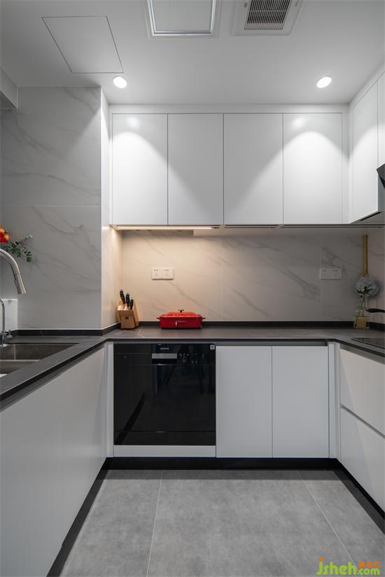 家裝設(shè)計(jì)打造洗切炒完備的U型廚房,地面采用的是格萊斯的灰磚,壓一下整個(gè)白色的空間,避免空間過于虛浮。墻面貼了白色花紋的墻磚。臺(tái)面是和餐邊柜同款的盤古巖板。廚房同樣采用的是燈泡凹陷的射燈點(diǎn)光源。
