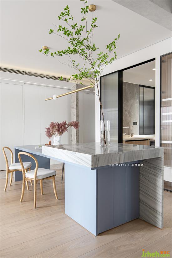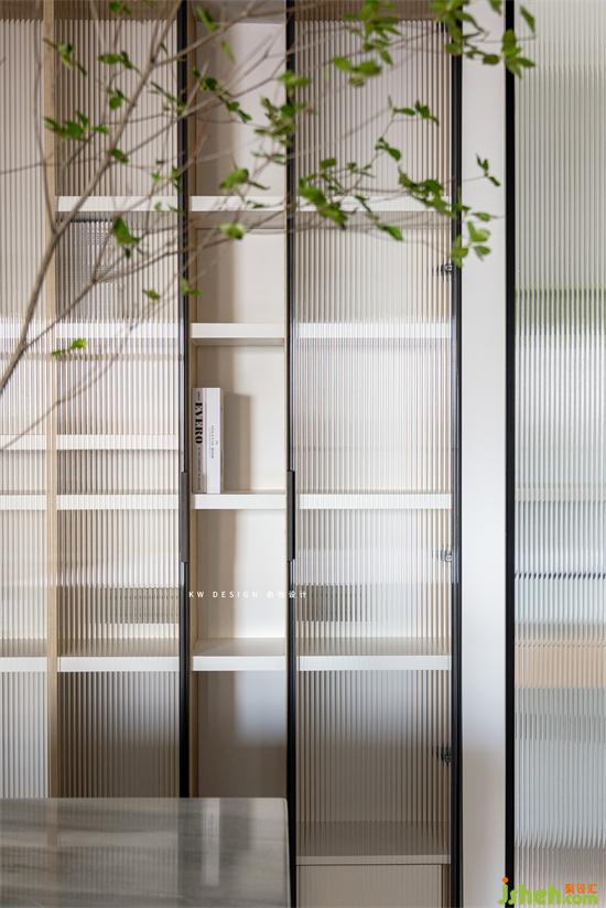 島臺下部也是有收納功能的柜子。這個角度可以看到廚房和玄關(guān)的一塊玻璃墻面。