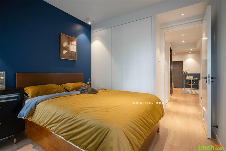 臥室無主燈設計,家裝設計局部照明營造舒適的睡眠空間,定制的胡桃木大床帶有隱形收納功能。