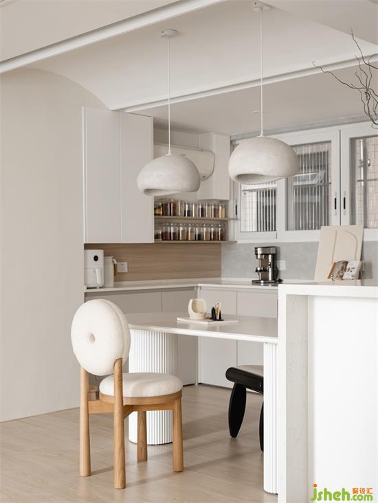 與客廳的彈性布置不同,餐廳常態(tài)化的生活場景更需要考究尺度和布置,連接客廳與輕食區(qū)的餐桌采用圓潤的形體,金桂大廈家裝設(shè)計白色塊面虛實交疊弱化分界,由自然流暢線條勾勒連接用餐儀式。
