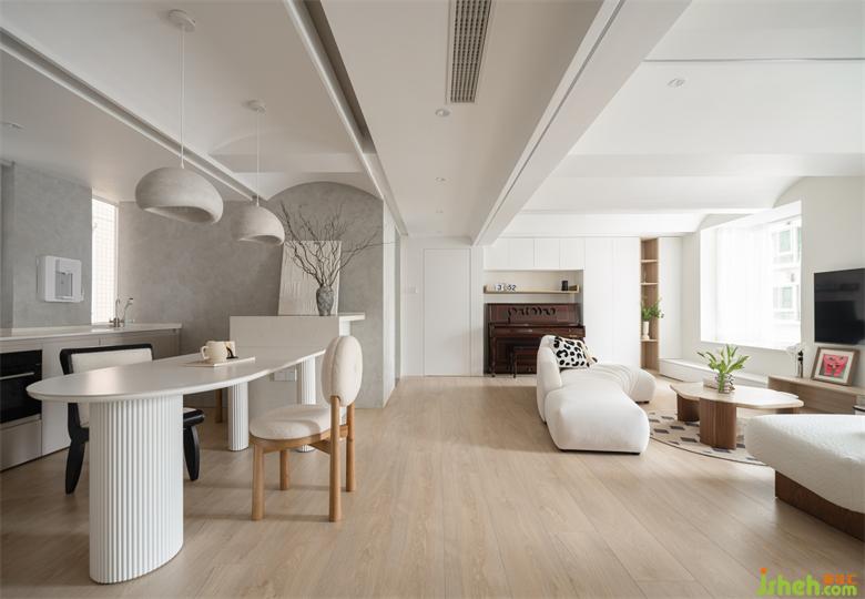 拱形吊頂延續(xù)至餐廳和過道,弧形的不斷重復(fù),金桂大廈家裝設(shè)計也構(gòu)成了綿軟的趣味性,內(nèi)嵌燈帶和筒燈營造空間溫暖浪漫氛圍。
