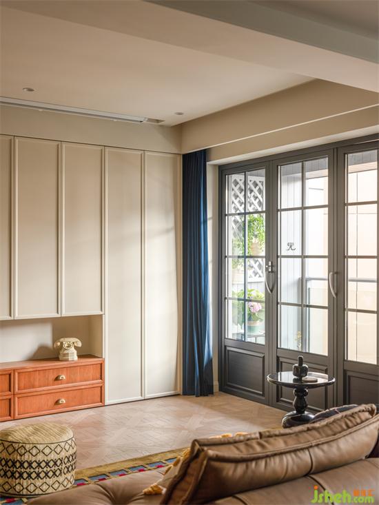 海納公館家裝設(shè)計引入“窗大門闊,明亮通風(fēng)”的建筑樣式,5米多的大開間由玻璃和百葉透進的光暈渲染窗明幾凈,復(fù)古空間飽滿而通透。