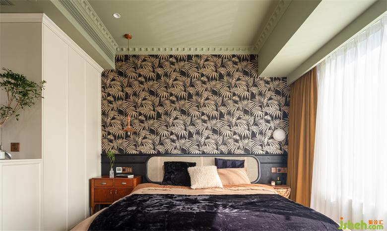 睡眠空間用色更加跳脫大膽,南洋風不可缺少的清涼與熱烈由墻至頂大面積渲染,床頭背景采用黑白相間的棕櫚葉裝飾壁紙,抹茶綠鋪陳天花,具象的綠意與夢幻的香薰裝點其中,為空間注入大自然的生機以及探索的神秘感。