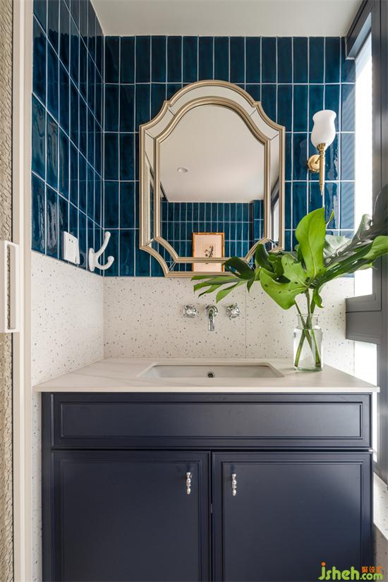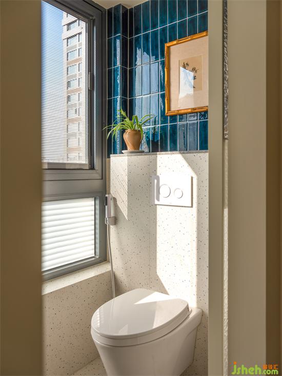 藍色系花磚與水磨石鋪陳的主衛(wèi)空間濃郁又清爽,兩分離布置實現(xiàn)日常的簡潔高效。