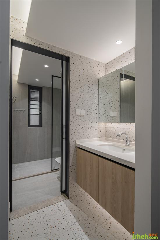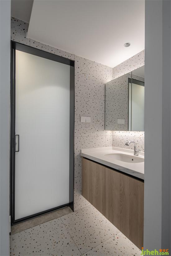 公衛(wèi)做了干濕分離,深圳豪峰園家裝設(shè)計以超白長虹波移門做分隔,靠過道的干區(qū)用與餐廳同花色的水磨石鋪貼墻地面。