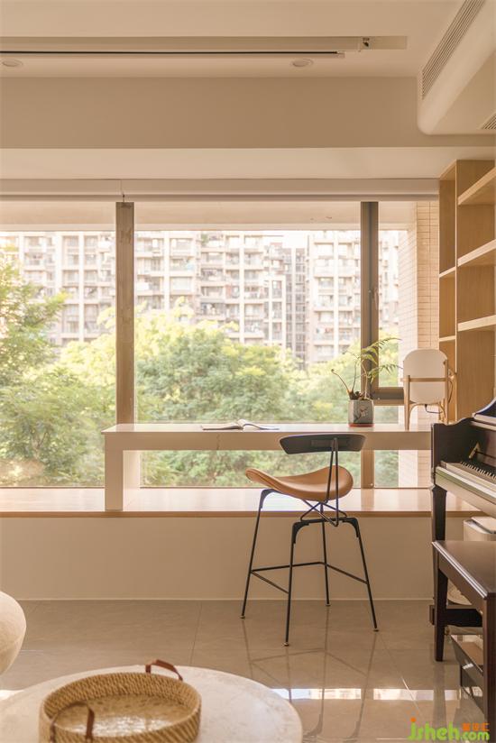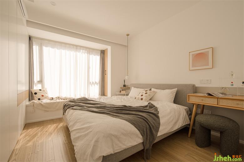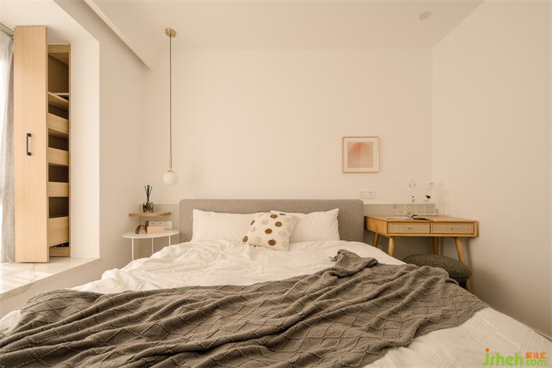層板搭配活動邊幾做床頭柜使用,擺放書籍和電子產(chǎn)品,吊燈在剛剛好的床頭高度,滿足女屋主睡前閱讀習(xí)慣。南山恒立心海灣家裝設(shè)計飄窗有處達六十公分深的凹位,除去窗簾盒位置還能定制30公分寬的抽拉式收納柜,可以放置更多睡前讀物,方便取用。