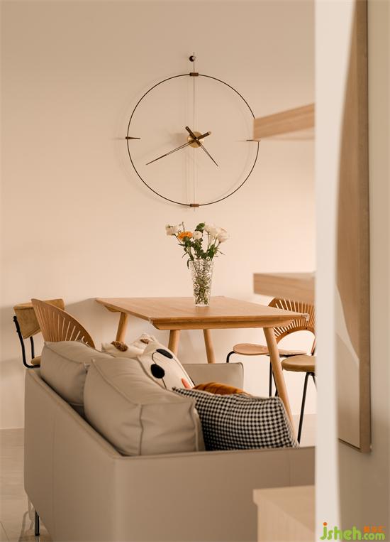 保證公共空間視野的開闊和延續(xù),餐廳的收納移至輕食區(qū),極簡nomon掛鐘搭配原木餐桌椅,營造簡單溫馨用餐氛圍。