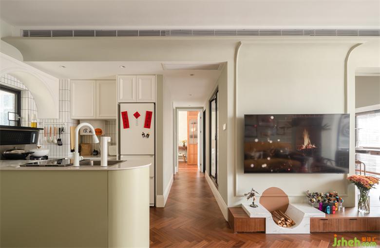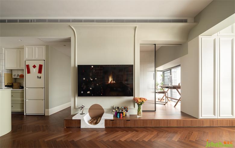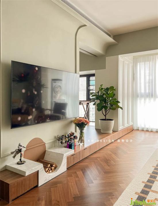 為了讓電視墻更具藝術感和個性化,在和兩位屋主溝通概念的時候溝通用壁爐的形式表現(xiàn),棲游家園家裝設計考慮柴火形式的壁爐不安全,最后考慮用大理石在抽屜上搭一個簡易爐的結(jié)構,放一些干柴,再刷一個接近火焰的墻漆顏色,這樣的搭配保留了壁爐的生態(tài)和原始的的溫暖意向,有了設計亮點也讓休閑區(qū)域充滿儀式浪漫。