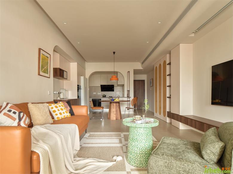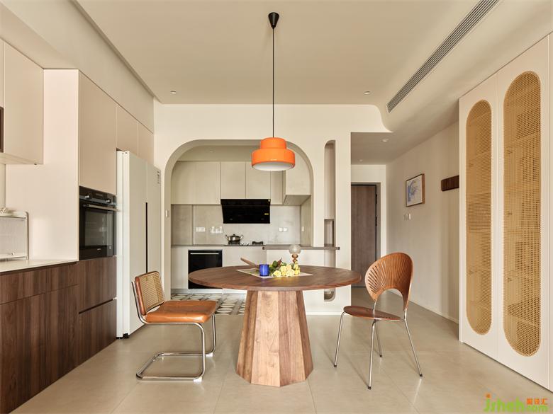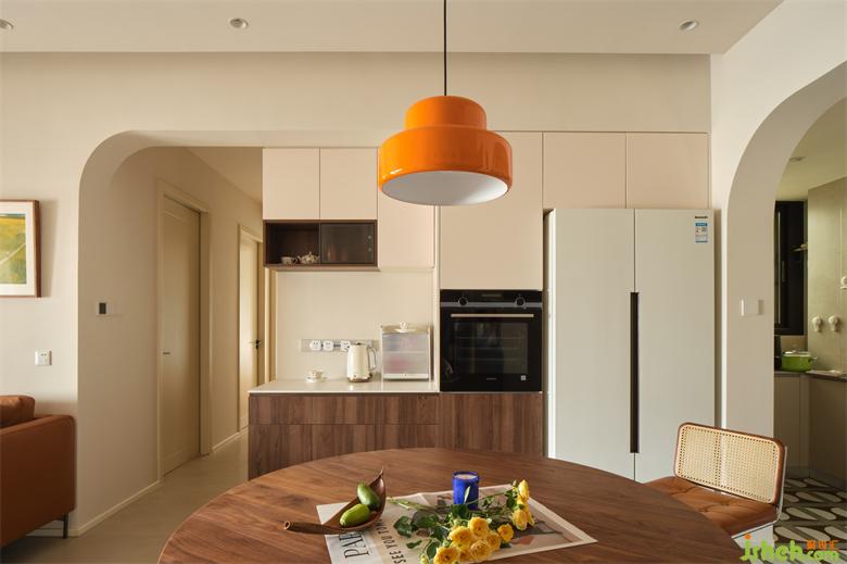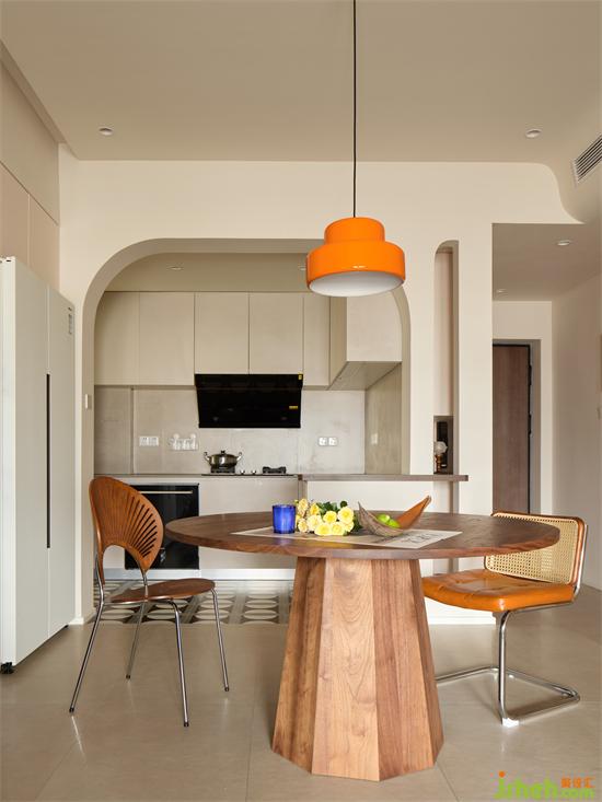 體快感十足的復(fù)古餐桌輔以橘色吊燈點(diǎn)綴,瀚海東岸家裝設(shè)計(jì)圍合團(tuán)圓意向同時(shí)釋放洄游居家動(dòng)線,沉穩(wěn)又清新的配色為中性空間注入暖意融融。