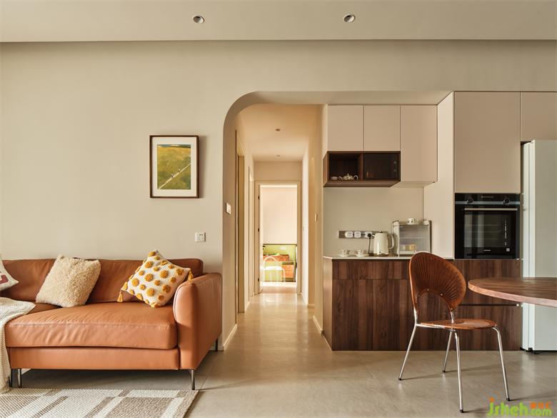 小區(qū)近海擔(dān)心防潮沒有大面積鋪木地板,公共空間通鋪柔光米灰磚,百搭好打理,0.6*1.2m的尺寸規(guī)格在視覺上提升空間縱深和設(shè)計(jì)感。