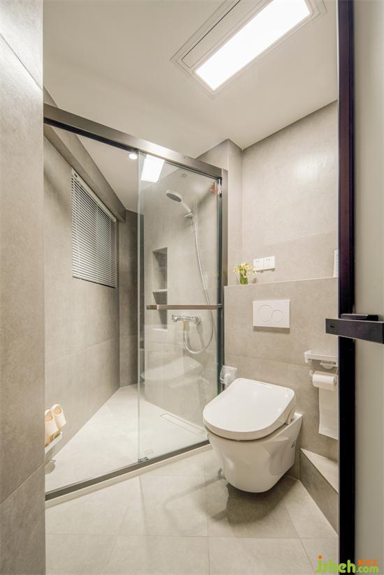 廚衛(wèi)皆是簡潔好打理的大灰磚鋪陳。家裝設計淋浴間的異型凹角留置熱水器以及各種清潔用具的收納。