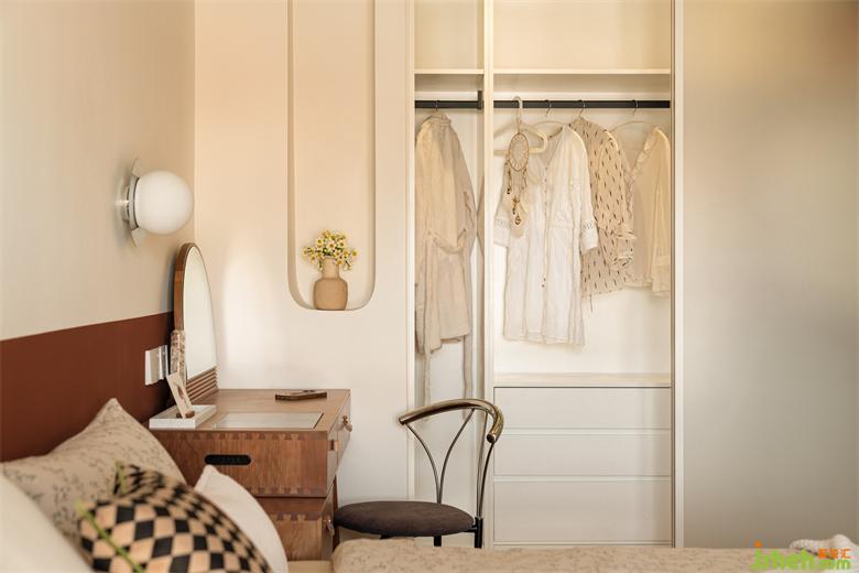 步入式衣帽間采用了白色磨砂推門,光影變動的朦朧質感夢幻美妙。