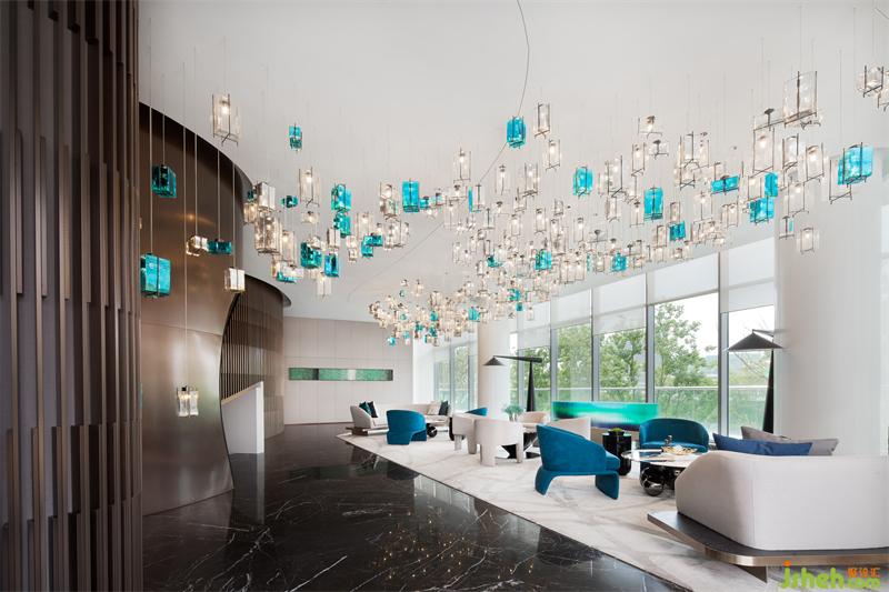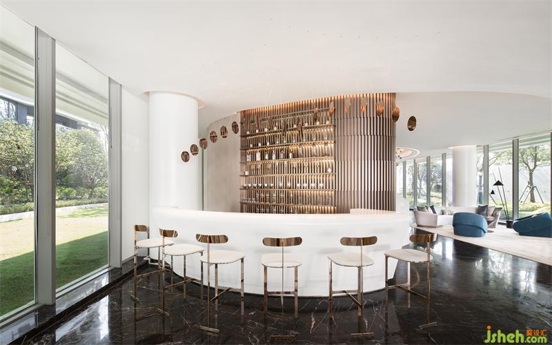 大自然賦予萬物變化的形體,湖水涌動仿佛要掙脫空間界定的桎梏。營銷中心設(shè)計運(yùn)用西方極簡繪畫手法將“百湖”的語言改編,轉(zhuǎn)化為藝術(shù)裝置的形態(tài),恰到好處地表現(xiàn)出空間的視覺張力。