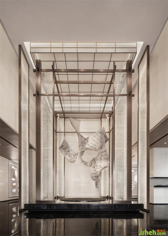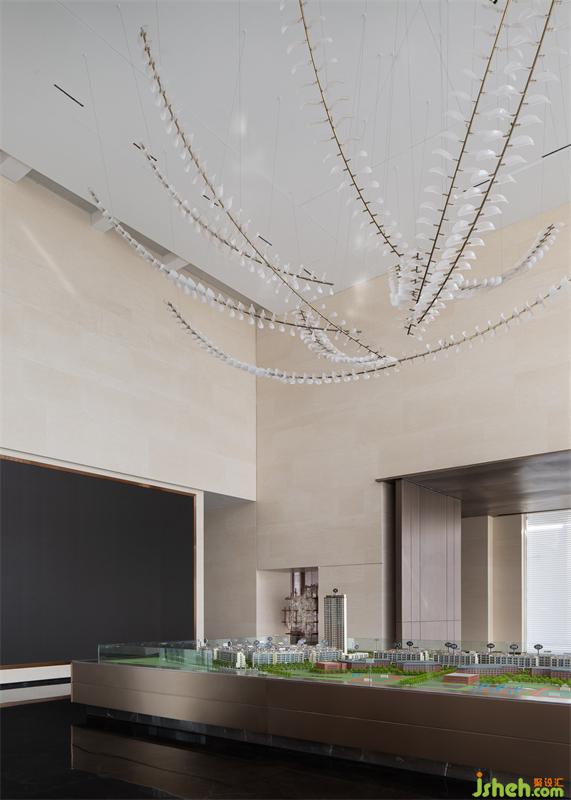 進(jìn)入前廳,在挑空的空間中衍生出楚風(fēng)遺韻,銷售中心設(shè)計(jì)帶有漢繡元素的藝術(shù)品以現(xiàn)代的材料和手法將其轉(zhuǎn)化,如一顆璀璨的明珠鑲嵌于中國(guó)斗拱結(jié)構(gòu)的框架內(nèi),只需要安靜仰望,便能感受到空間本身的精神——這個(gè)城市及在此生活的人的歷史變遷與分合。
