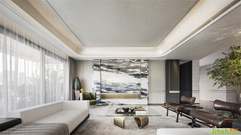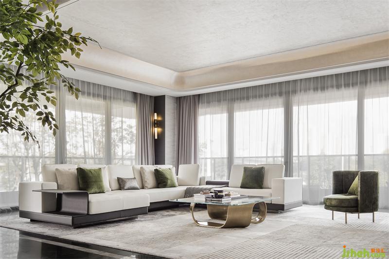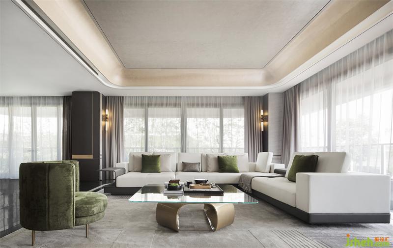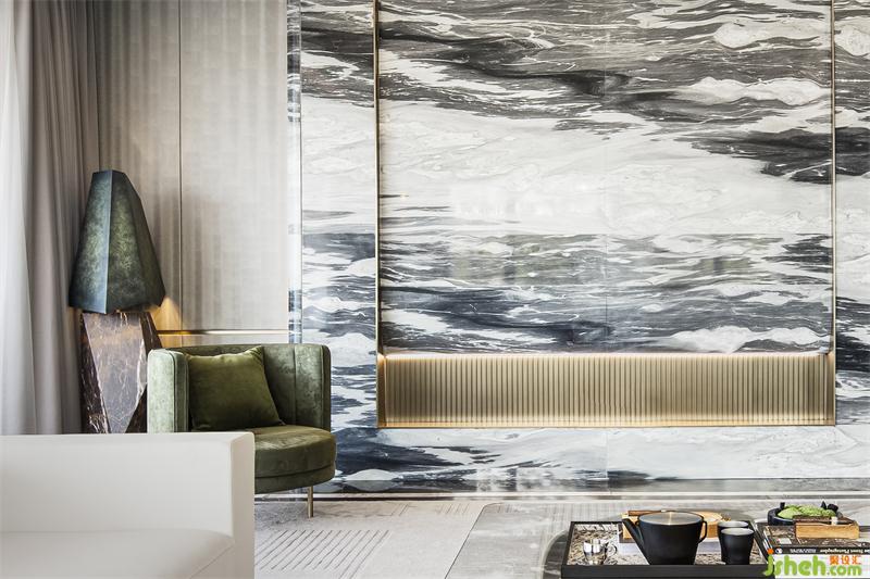 悠然步入客廳,色調(diào)的碰撞,線條的交錯,不同材質(zhì)之間組成了一幅令人眼前一亮的畫面。樣板房設(shè)計空間以白為主色,點綴些許橄欖綠。輕盈的窗簾、溫潤的木質(zhì)、雀躍的金屬、沉穩(wěn)的石材,在白色鋪陳的冷靜氛圍中,揮發(fā)出各自的物性。