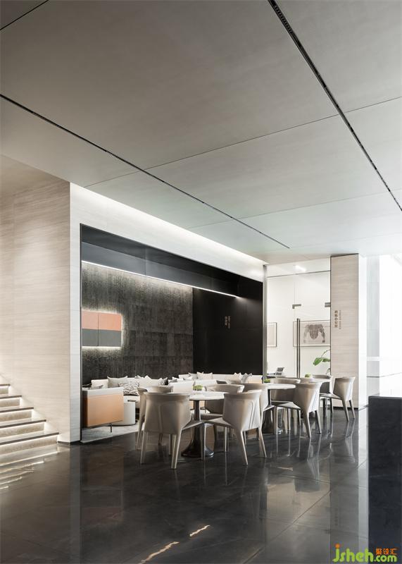 從接待區(qū)出發(fā),開(kāi)啟邕江文化之旅。潑墨大理石瓷磚地面和木紋石墻面從入口處延伸至內(nèi)部,頂面的軌道燈與造型線(xiàn)條燈如同城市軌道與橋梁橫梗其上,在藝術(shù)燈光與自然光影的交相輝映下,以多元視角觀照著來(lái)者內(nèi)心的精神共鳴。