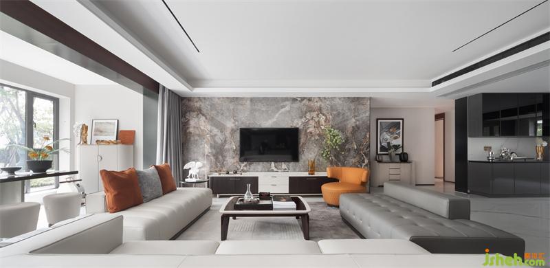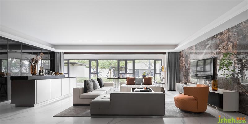 靈活的U型沙發(fā)將空間分割出不同的生活場(chǎng)景,點(diǎn)綴愛馬仕橙的單人皮椅,平衡了冷與暖的視覺感受,藝術(shù)擺件與植物的光影映照,流露出現(xiàn)代美學(xué)光澤,在日出黃昏中,不動(dòng)聲色的捕捉生活中的美好與希冀。