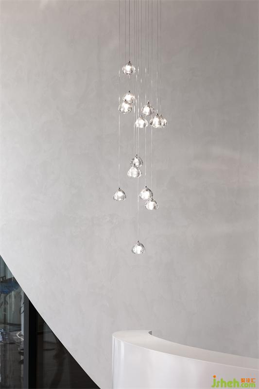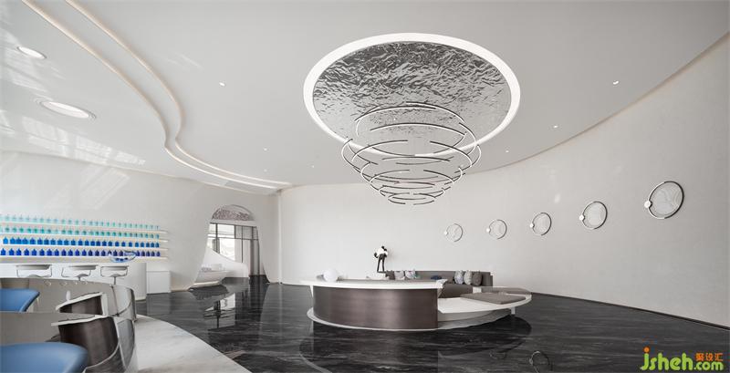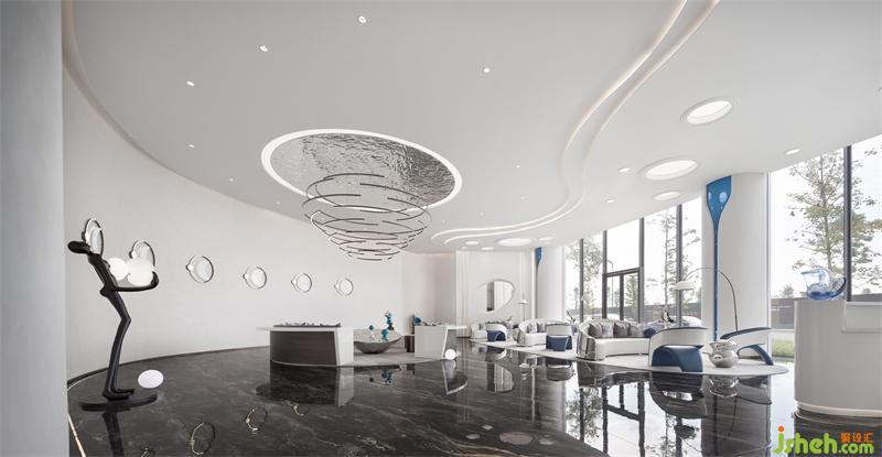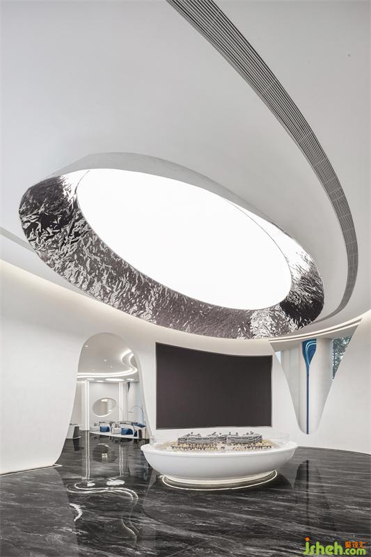 月的化形,水的意境,組成沙盤區(qū)藝術結構的弧度表征,柔和的光自上而下彌漫開來,如圓月在水面投射的倒影,暈出波紋般的流光。入口接待區(qū)四周灑落的點點星光,是自然意象與當代材質碰撞出的詩意,猶如洞中螢火蟲發(fā)出熒光,讓四周變得夢幻起來。