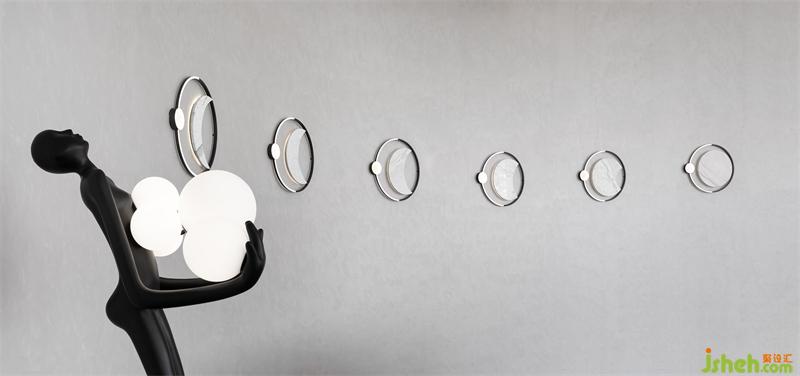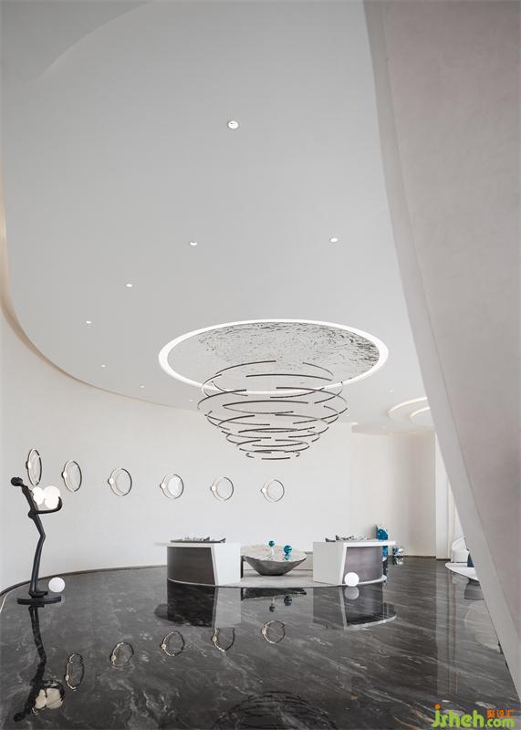 沙龍卡座區(qū)整體呈開放姿態(tài),綿延的月相燈飾和鏡面天花相碰撞,營銷中心設計以流動的韻律呼應中軸線上的金屬藝術裝置,賦予了視覺強烈的沖擊力。一條條游走于空間的線條,是潮起潮落的表象,讓觀者開啟奇幻的江影月相之旅。