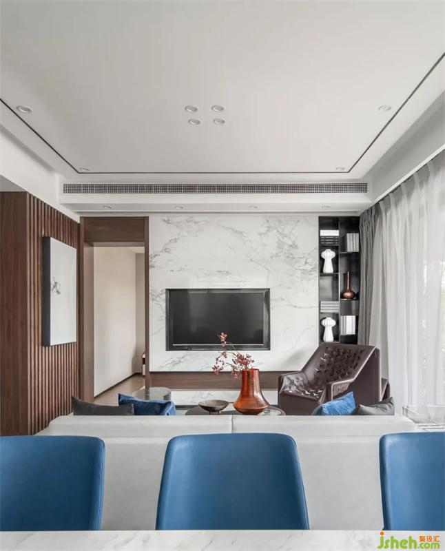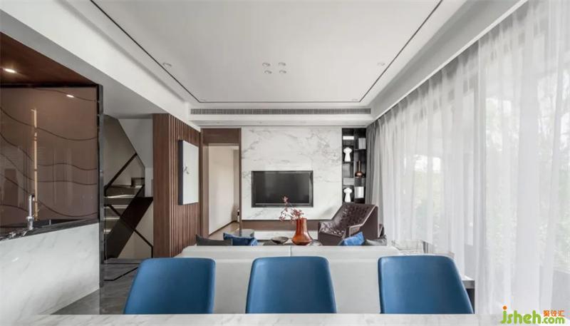 落地窗對景自然,映出庭院蔥蘢翠綠之意。別墅裝飾于開放式空間鋪陳對藝術(shù)的觀想,引入自然光,輔以不同色度的主調(diào)藍(lán),在一種有層次波瀾的靜謐感里,回應(yīng)居者內(nèi)心的前衛(wèi)藝術(shù)潮流與生活態(tài)度。