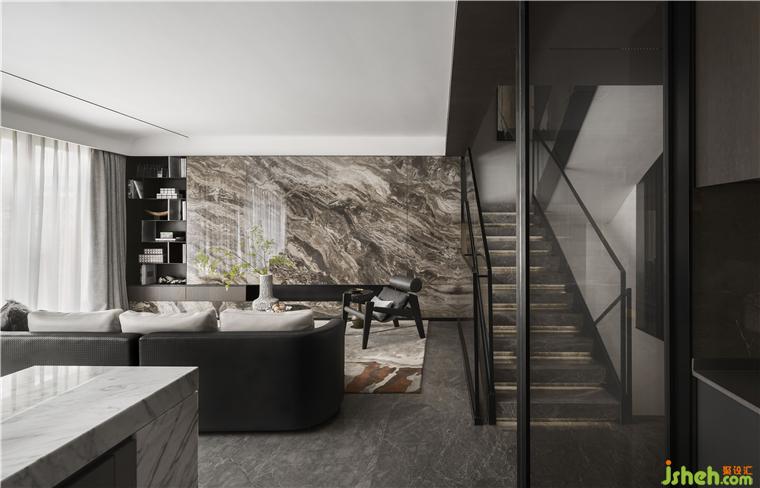 整體空間色彩以深淺不一的灰色系打造獨特氣質(zhì)??蛷d空間方正,天然大理石結(jié)晶出時間的浪漫,糅雜著金屬線條。樣板房設(shè)計在深色木紋飾面板的相互結(jié)合下,各種材質(zhì)以各司其職,引發(fā)了感官及精神層面對美的通感。