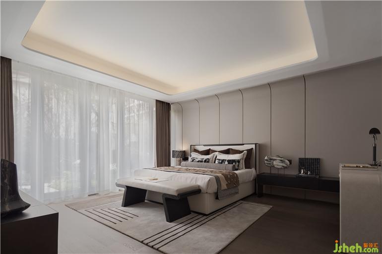 精細(xì)化的全齡化分區(qū)設(shè)計(jì),滿足了家庭三代人及客人來訪的不同需求。作為情感和心理需求的依托,樣板間設(shè)計(jì)極度克制的去弱化符號(hào)性的形式,主臥以溫潤(rùn)木質(zhì)色調(diào)為基底,增加了私域的溫度感。明與暗的顏色對(duì)比,線與形的造型顯現(xiàn),在光滑與柔軟的肌理碰撞下,平衡了視覺同時(shí)也予人心靈的共鳴。