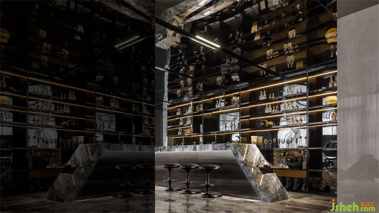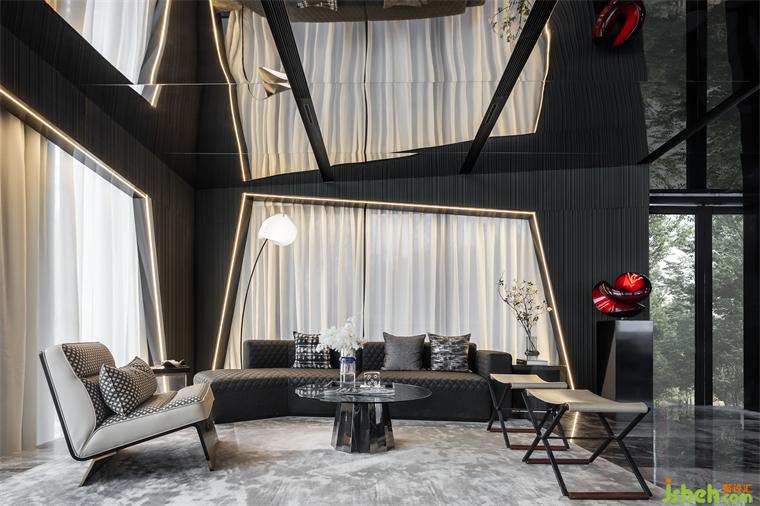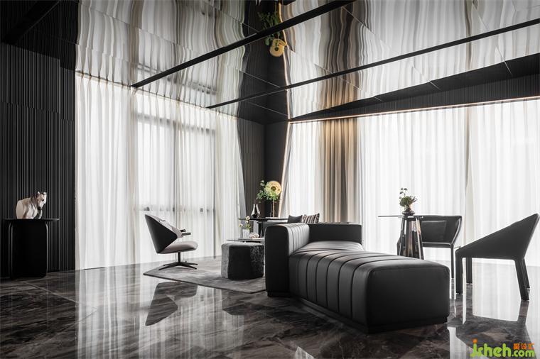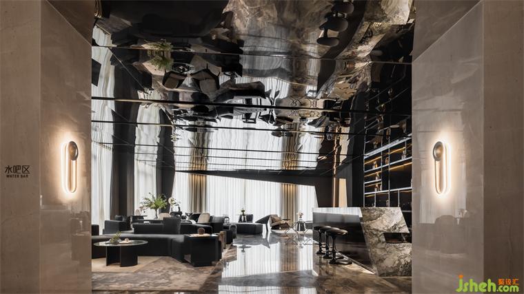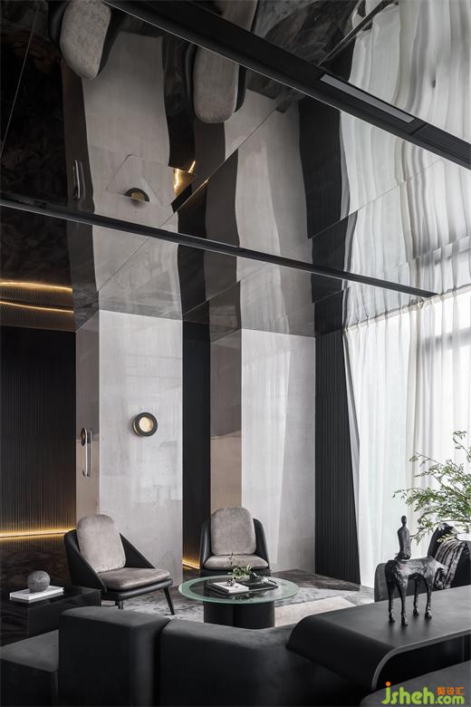 延續(xù)宇宙的神秘,洽談區(qū)空間以大量鏡面材料為背景,頂面采用灰鏡斜面設(shè)計,實現(xiàn)縱深感。不規(guī)則異形窗框的使用,渲染出充滿生機的空間力量。在精準(zhǔn)的比例中,用嚴(yán)謹(jǐn)?shù)膸缀沃刃騺順?gòu)建感性的場域,生活的姿態(tài)與宇宙的無盡在這一刻得以共鳴。