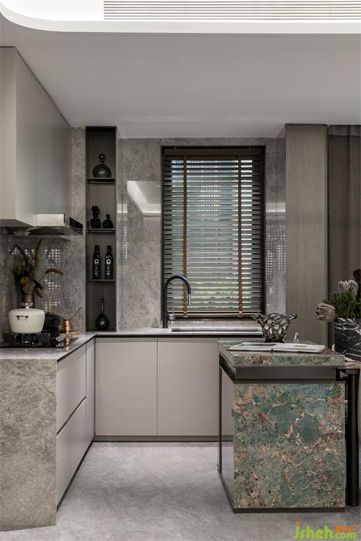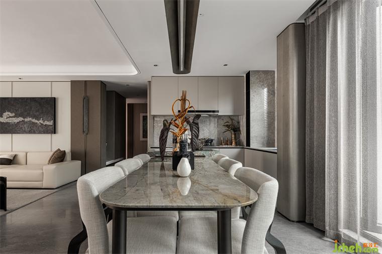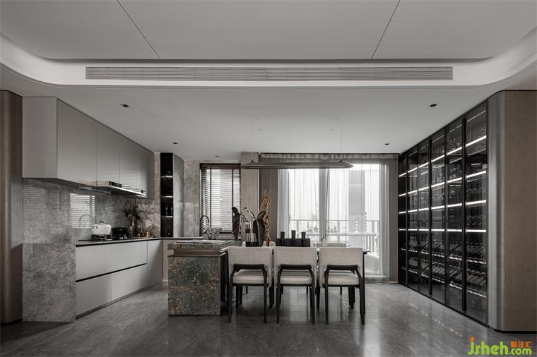 島臺餐桌一體式設(shè)計,操作便利。餐廳背后的酒柜把生活場景相互融入廚房的濃濃煙火氣里。在客餐廚之間自由切換,一步到位解鎖多個場景。樣板房設(shè)計三餐四季,人間煙火,見證了用餐時家人的歡聲笑語,也記錄下生活最真實的模樣。