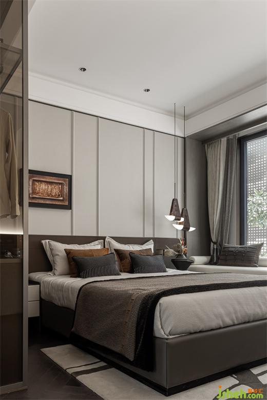 主人套房位于南向,擁有絕佳采光和通風(fēng)條件,集合獨立衣帽間與衛(wèi)浴系統(tǒng)等多種功能。樣板房設(shè)計以東方形塑當(dāng)代,讓雅意回歸,低飽和背景與深色床品搭配皮革,不設(shè)過分艷色,通過線條感的設(shè)計打造出流動的空間體驗,詩意,至此縈繞。